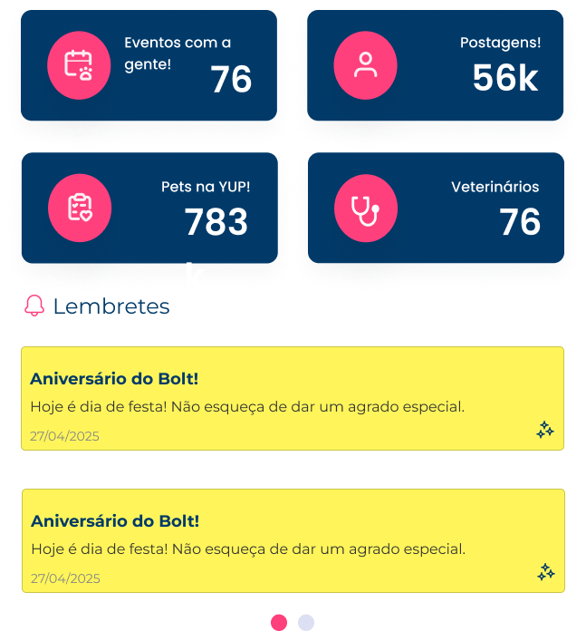 A YUP é um aplicativo que reúne informações genéticas dos seus pets como peso, idade e altura. Além disso, é possível armazenar exames, criar lembretes de vacinas e medicamentos. Outra funcionalidade é encontrar petshops, clínicas, passeadores, entre outros prestadores de serviço em nosso aplicativo. Tudo isso, com ajuda da nossa IA para tirar todas as suas dúvidas.